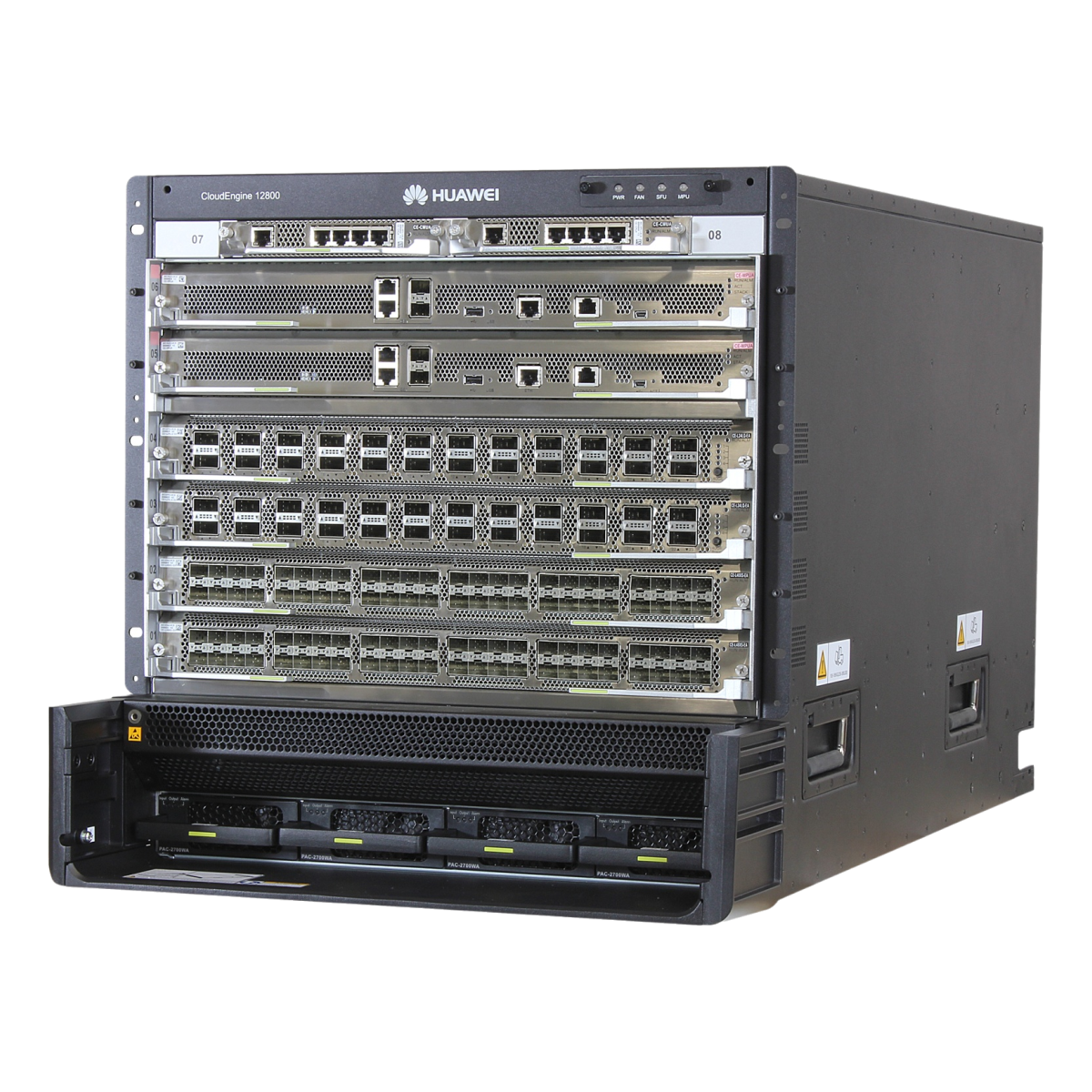 Huawei CloudEngine 12800 series switches are high-performance core switches designed for data centers and high-end campus networks. Providing stable, reliable, secure, and fast L2 and L3 switching services, the switches help enterprises build elastic, virtual, agile, and high-quality networks. CloudEngine 12800 boasts an ultra-large switching capacity of up to 178 Tbit/s (scalable to 1032 Tbit/s) and supports 576 x 100 GE, 576 x 40 GE, 2304 x 25 GE, or 2304 x 10 GE line-speed interfaces. Coupled with industrial-grade reliability, comprehensive virtualization capabilities, and a variety of data center service features, the switches meet the diverse requirements of data center networks of tomorrow, today. And thanks to multiple energy conservation technologies and a strict front-to-back airflow design, CloudEngine 12800 can do more all while consuming less power.