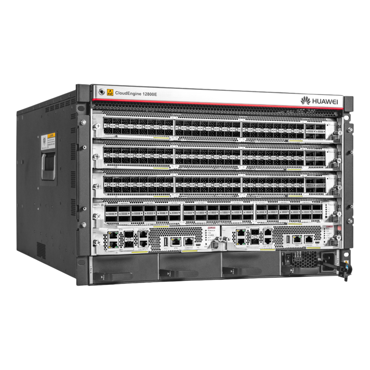 Huawei CloudEngine 12800 series switches are high-performance core switches designed for data centers and high-end campus networks. Providing stable, reliable, secure, and fast L2 and L3 switching services, the switches help enterprises build elastic, virtual, agile, and high-quality networks. CloudEngine 12800 boasts an ultra-large switching capacity of up to 178 Tbit/s (scalable to 1032 Tbit/s) and supports 576 x 100 GE, 576 x 40 GE, 2304 x 25 GE, or 2304 x 10 GE line-speed interfaces. Coupled with industrial-grade reliability, comprehensive virtualization capabilities, and a variety of data center service features, the switches meet the diverse requirements of data center networks of tomorrow, today. And thanks to multiple energy conservation technologies and a strict front-to-back airflow design, CloudEngine 12800 can do more all while consuming less power.