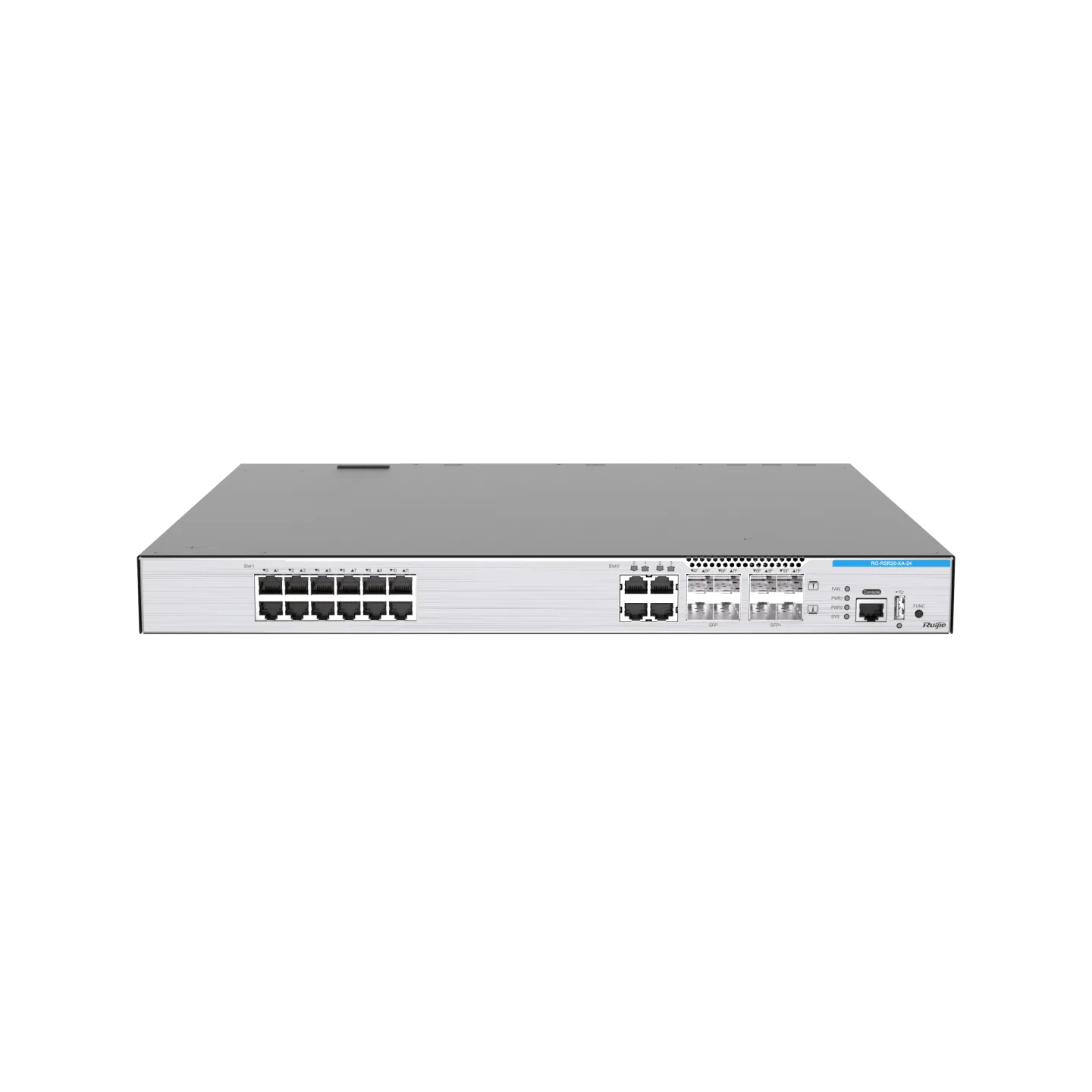 | RG-RSR20-XA-54 | RG-RSR20-XA-54 chassis, 6 x fixed WAN ports (2 x 10GE optical ports and 4 x 1GE electrical ports) and 48 x 1GE electrical LAN ports (LAN/WAN port switching), 4 x Expansion slots, 1 x USB 2.0 port, 1 x console port |