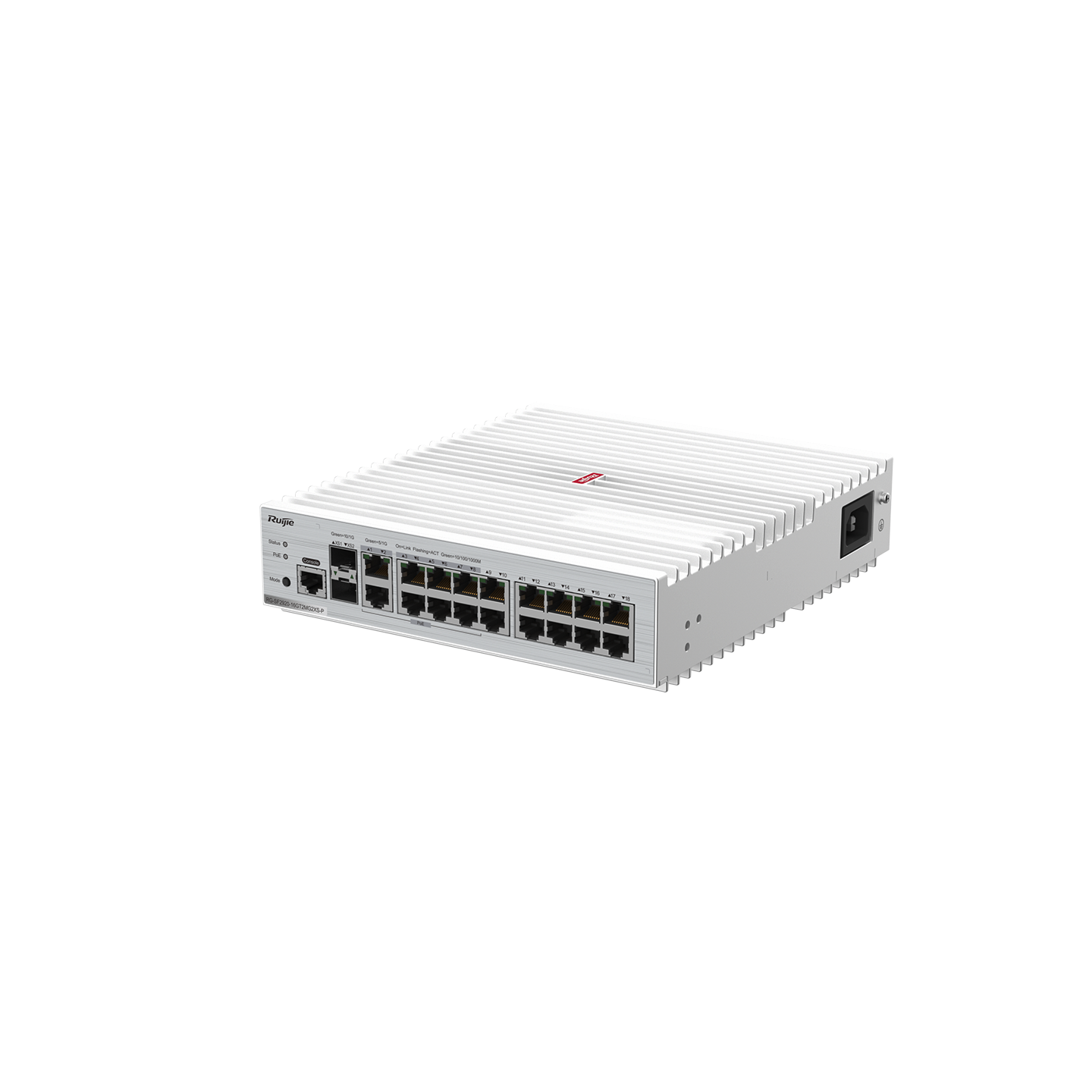 | RG-SF2920-16GT2MG2XS-P | 16 x 10/100/1000M auto-negotiation electrical ports, 2 x 1000M/2.5G/5G auto-negotiation electrical ports, 2 x 1/10G SFP+ ports, fixed single AC power supply; electrical ports 1-8 support PoE/PoE+; maximum PoE output power: 125 W |