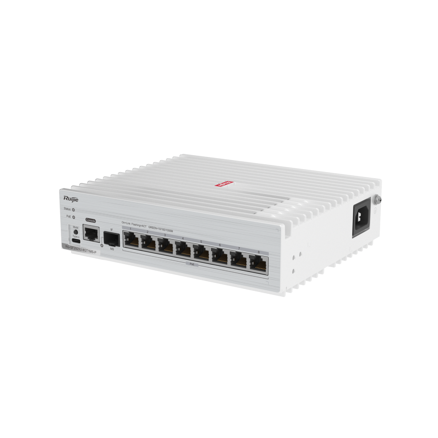 | RG-SF2920U-8GT1MS-P | 8 x 10/100/1000M auto-negotiation electrical ports, 1 x 1000M/2.5G SFP port, fixed single AC power supply; electrical ports 1–8 support PoE/PoE+; maximum PoE output power: 125 W |